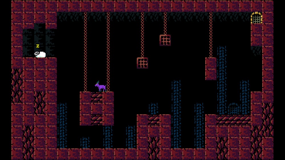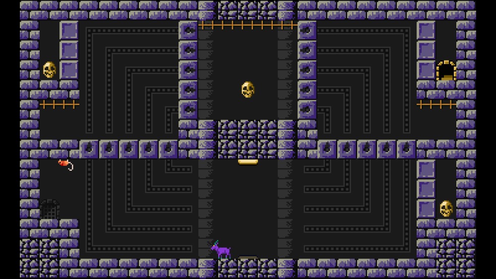 Escape Goat is a puzzle platforming game that puts the player in the role of a purple goat that has been imprisoned for the crime of witchcraft. Your goal is to escape the fearsome prison of Agnus, and to do so you'll have to clear several sets of single screen rooms by reaching the exit. Doing so is harder than it sounds, since each room is challenging in its own way. Fortunately, you have some good platforming skills at your disposal, including a double jump and a dash move. Plus, you've managed to enlist the help of a friendly mouse, who proves to be very useful indeed.